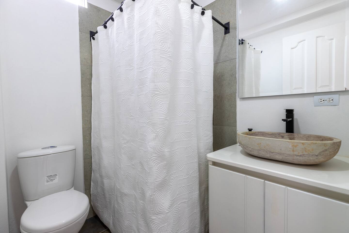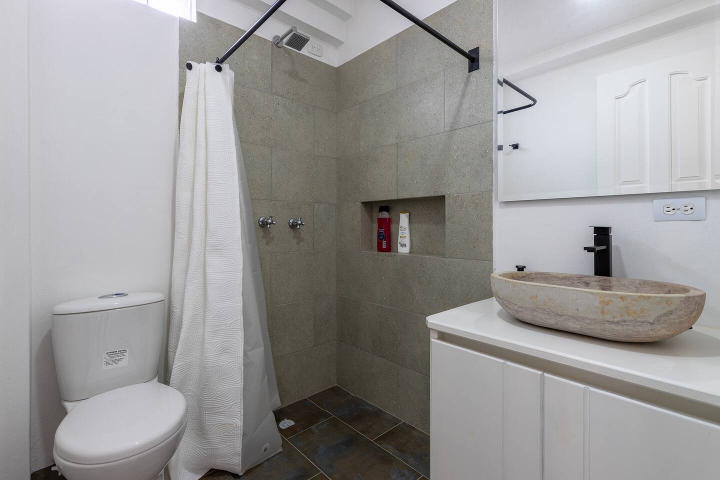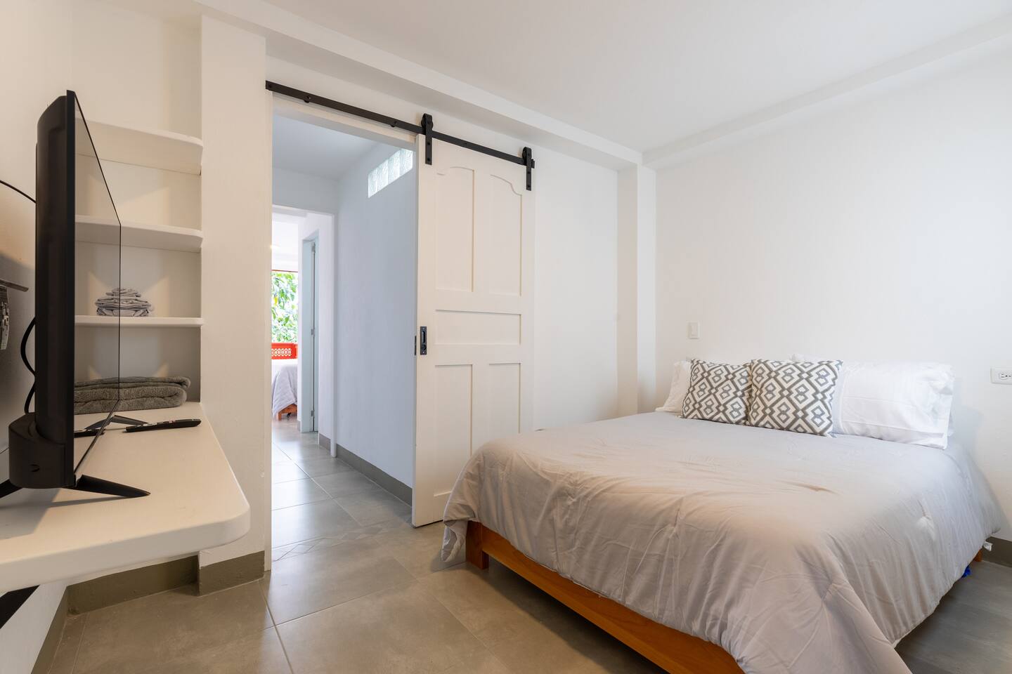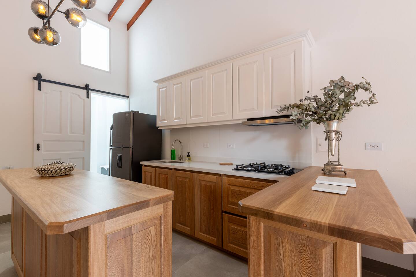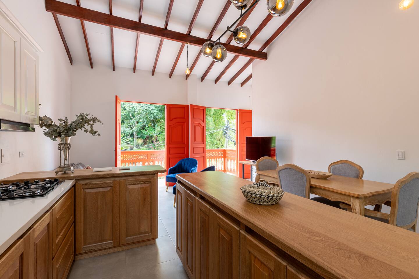 El espacio principal ofrece una generosa sala de estar, donde la luz natural se filtra a través de las amplias ventanas, destacando los elegantes muebles y los detalles decorativos cuidadosamente seleccionados. Los tonos neutros y los toques de colores cálidos crean una atmósfera acogedora y relajante, perfecta para descansar después de un día explorando las maravillas de Jericó. La cocina gourmet es un sueño hecho realidad para los amantes de la cocina, equipada con electrodomésticos de última generación y una isla central espaciosa que invita a la socialización mientras se preparan deliciosas comidas. El comedor adyacente ofrece un ambiente refinado para disfrutar de cenas íntimas con vistas al exuberante paisaje exterior. Las tres habitaciones son verdaderos refugios de tranquilidad y elegancia. Cada una está decorada con un estilo único, ofreciendo una combinación perfecta de confort y lujo. Las camas con sábanas suaves y acogedoras prometen noches de descanso reparador, mientras que los baños privados, exquisitamente diseñados, invitan a relajarse con duchas de lluvia y bañeras de lujo